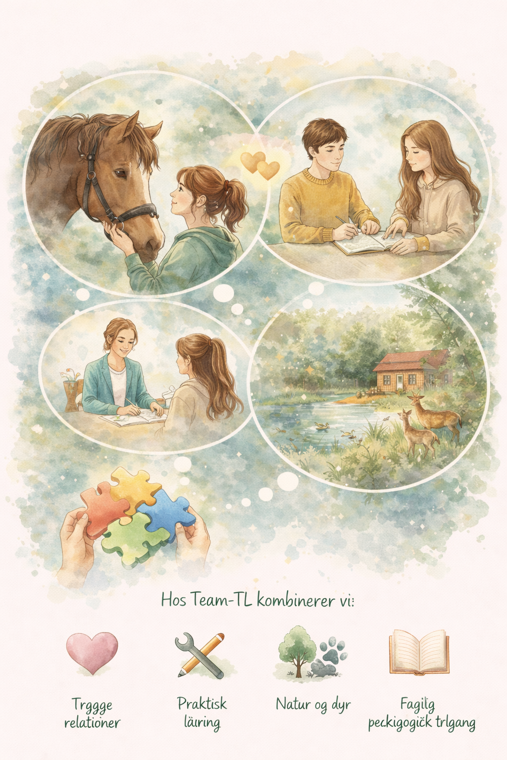 Hos os kombinerer vi praktisk læring, relationelt arbejde og naturbaserede aktiviteter, herunder forløb med dyr gennem vores HorseTeam. Vi arbejder helhedsorienteret med fokus på udvikling af personlige, sociale og faglige kompetencer, så den enkelte opnår større selvstændighed, mestring og deltagelse i hverdags- og arbejdsliv.